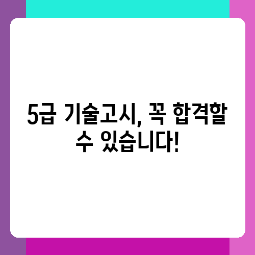 지금까지 5급 기술고시 합격 전략에 대해 알아봤습니다. 힘든 과정이지만, 포기하지 않고 노력한다면 꼭 합격할 수 있습니다. 자신감을 가지고, 꾸준히 노력하세요! 여러분의 꿈을 응원합니다! 궁금한 점이 있다면 언제든지 질문해주세요. 함께 고민하고 함께 극복해 나가요.